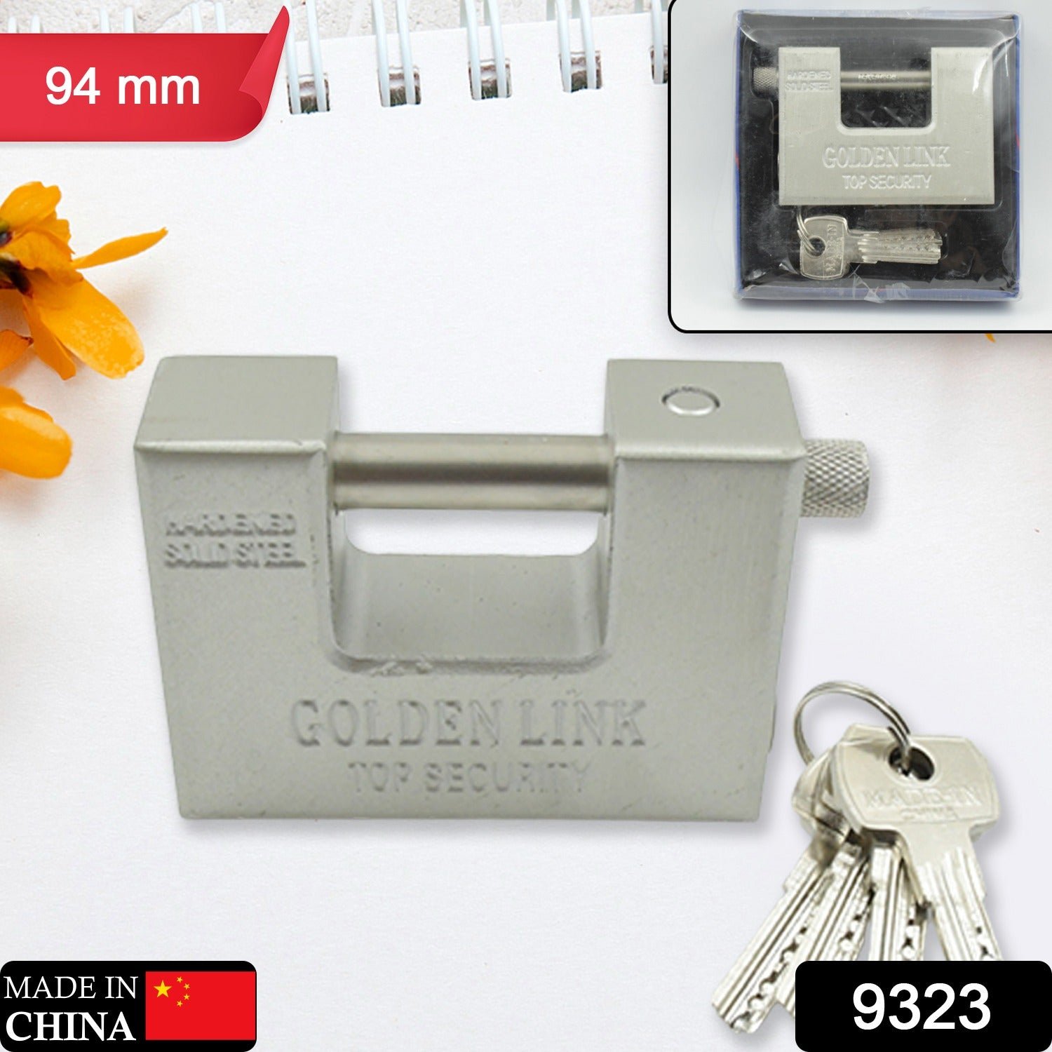 9323 Stainless Steel Padlock | Rectangular Shape | Hardened Steel | High Resistance With 5 Keys, Door Lock for Home Dormitory, Waterproof Antirust Anti-theft Padlocks Outdoor Gate Shed Locks Warehouse Big Door Drawer Lock (94 MM)