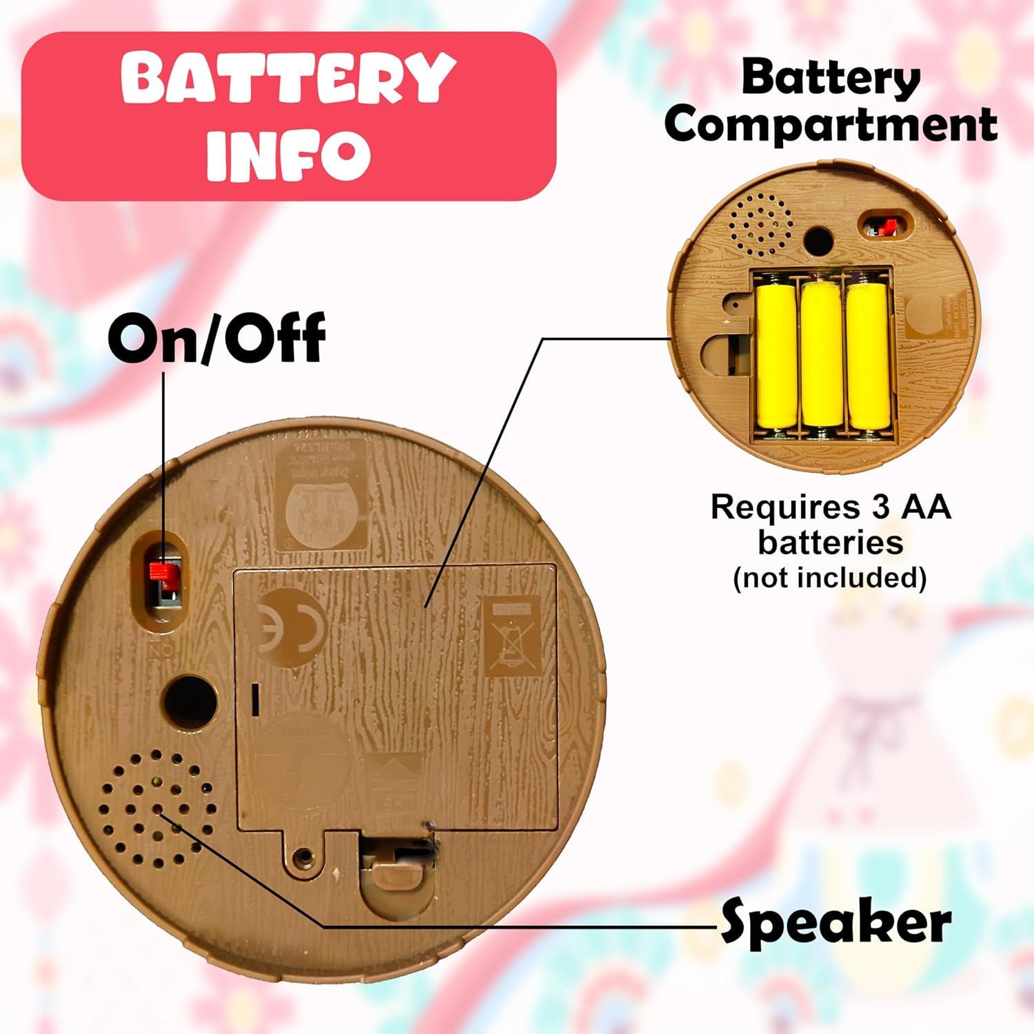 - 【POWER SUPPLY】:- Requires 3 x ‘AA’ size 1.5V batteries (NOT included). The on/off button is located beneath the toy.
